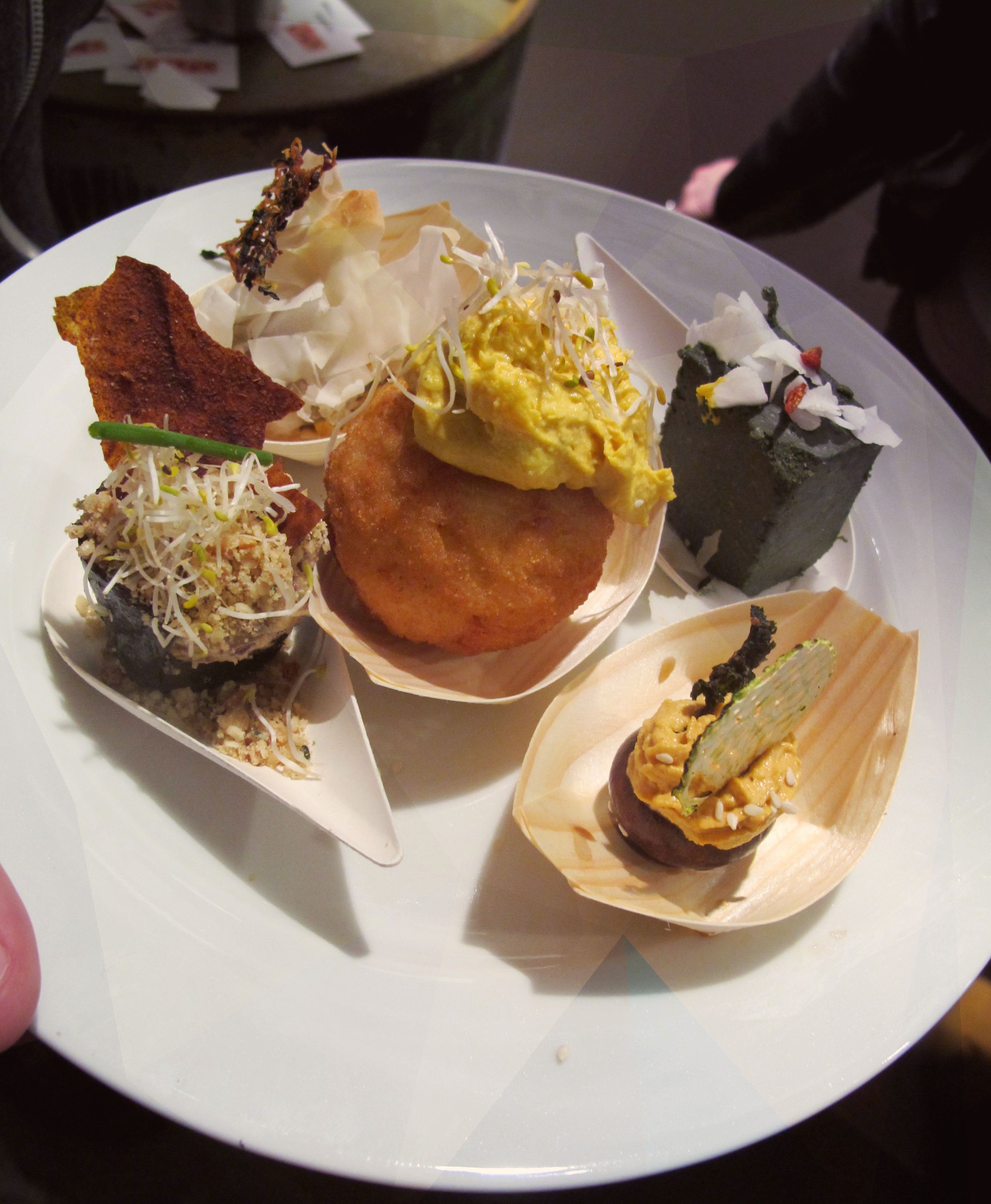 Eine Stunde später stehe ich im Kraftwerk. Berlin-Food-Week. Kalte Betonfeiler, von oben nacktes, blaues Licht. Stimmenrausch, Treiben und Geruchextreme. Erstmal Probiermeile. Cremigstes Rhabarber-Confit von marmelo, Apfelstrudel- schnaps, Fingersalz mit fruchtiger Zitrone und richtig guter Kombucha von der Berlin Kombucha Society. Im Vorbeigehen auch mal die Paleo-Palette durchprobiert – den Hype verstehen. Dann die Restaurant-Street. Sich entscheiden. Nach Auge, nach Gefühl: Neon-Püree von Chicha mit crazy Topping. Berlin Cuisine verspricht Berliner Küche und ist so garnicht Berlin, denn hinter spritzigem Johannisbeeren-Schaum türmen sich allein fetteste Steaks. Ich bleibe stehen bei gnamo, das heisst, ich drängel mich durch die staunende Traube. Gnamo, laut Restaurant-Street-Guide für Nicht-Traveller, Gerne-Urlauber mit Wald- oder Bergfeeling. Whatever.