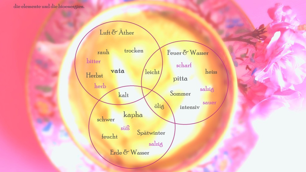 Die Dosas oder auch Bioenenergien, setzen sich aus jeweils zwei Elementen zusammen. Sie heissen vāta, pitta und kāpha. Vāta setzt sich aus Luft und Raum, Pitta aus Feuer und Wasser, Kapha aus Wasser und Erde zusammen. Vata steht für die Kraft der Bewegung (skt. vikśepa) und ist in seinen Eigenschaften leicht und trocken. Pitta ist die Kraft der Transformation und Aktion (ādāna). Pitta zeigt sich in Hitze und Intensivität. Kapha, die Kraft der Struktur und Stabilität (skt. visārga), ist feucht und schwer.