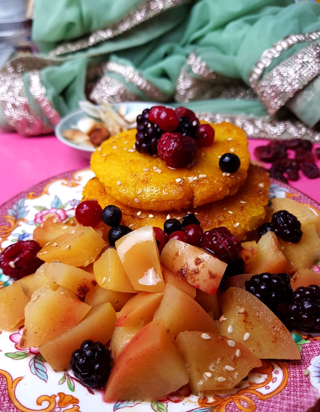 Polenta-Kuchen auf einen Teller geben, Apfelmus dazu, gegebenenfalls mit etwas Ahornsirup süßen.