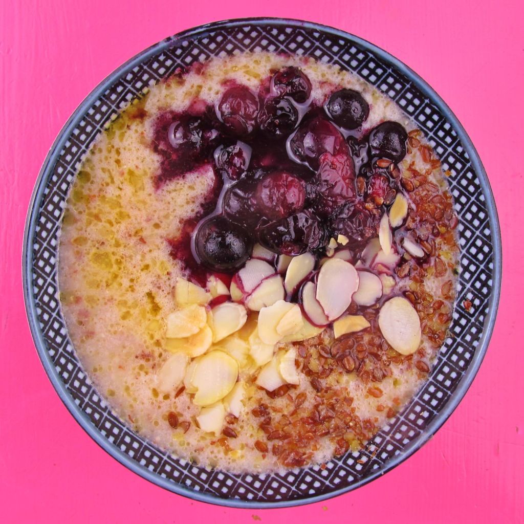Porridge in eine Schüssel geben und mit den warmen Blaubeeren übergießen. Fertig!
