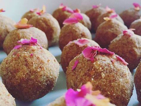 Du kannst aus der abgekühlten Masse Kugeln formen und diese in Kokosflocken oder Rosenblüten wälzen.