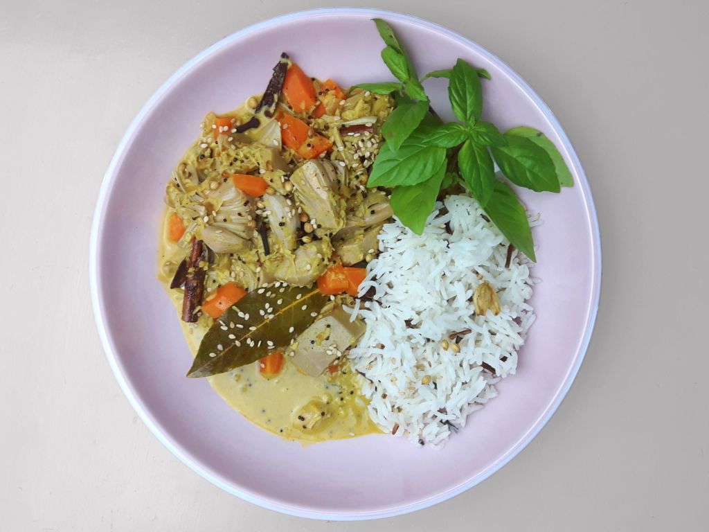 Jackfruit und Kokosmilch dazu geben, Kurkuma und Garam Masala darüber streuen und verdeckt ungefähr sieben Minuten köcheln lassen. Mit Salz und Ahornsirup abschmecken. Dazu passt Wildreis und Thai-Basilikum.