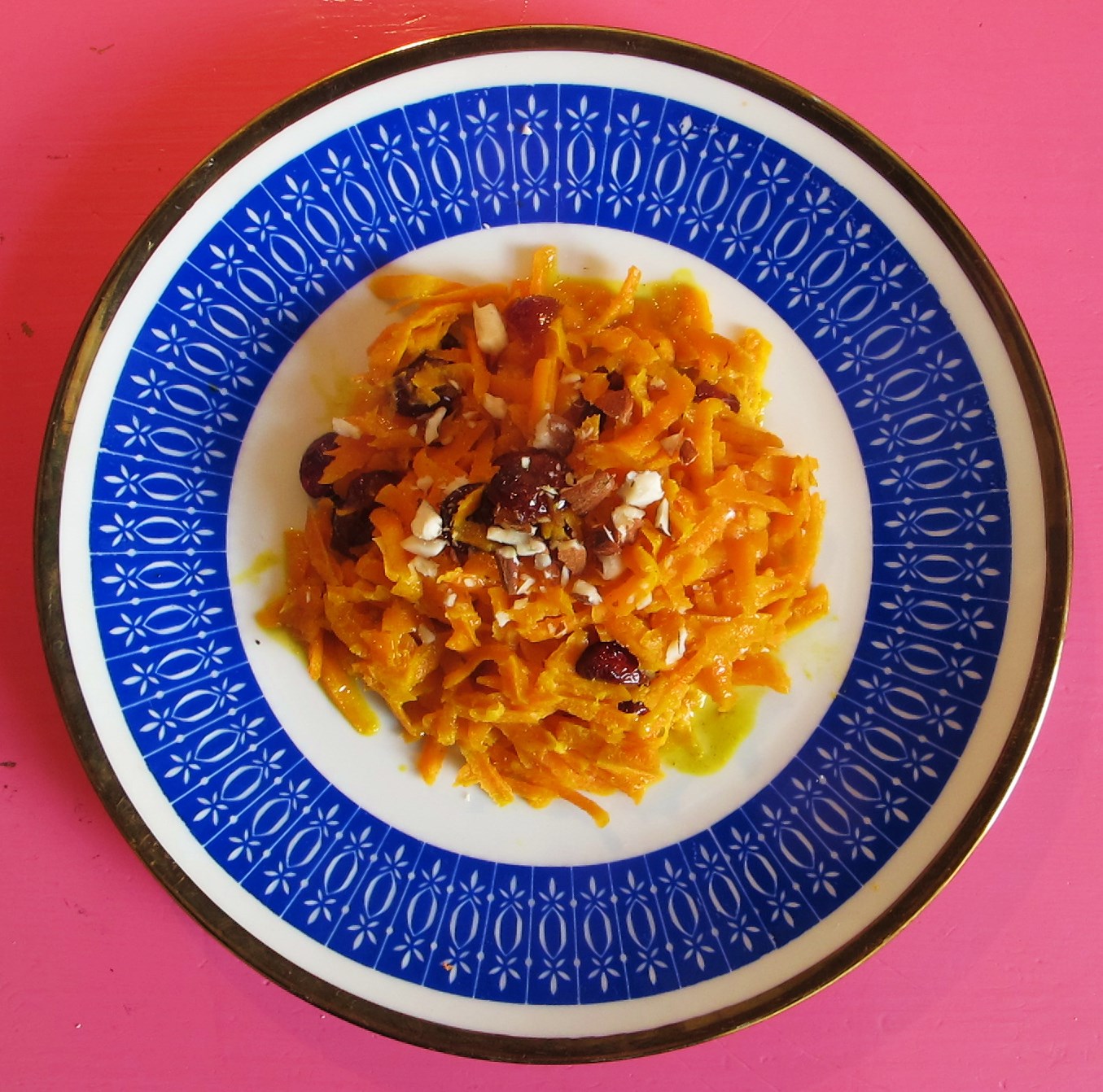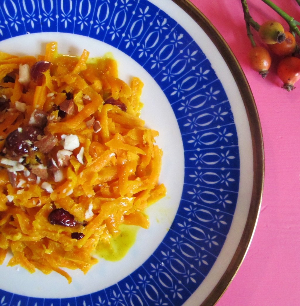 Fett in einem Topf zum Schmelzen bringen. Karottenraspel dazu geben und etwas andünsten lassen. Gewürze, Zucker und Cranberries dazu geben. Rühren.