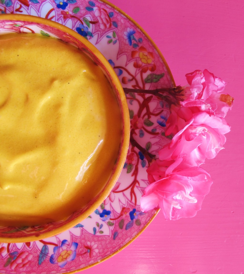 Ich fülle das Mango-Püree in einen Plastikbehälter um und lasse es über Nacht gefrieren. Nächsten Tag tu‘ ich den Pulp mit den anderen Zutaten in einen Mixer. Cremig mixen. Fertig.