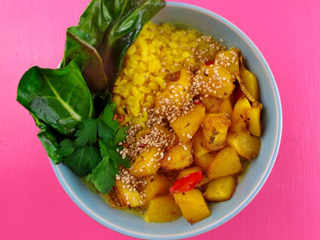 Kokosfett in einem Topf zum Schmelzen bringen. Senfsaat dazu geben, erhitzen, bis sie im Fett springt. Ingwer, Chili und Scharlotte dazu geben und dünsten.