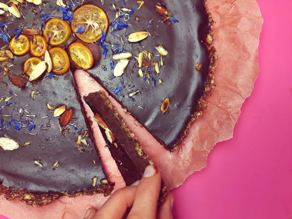 Raw-Cacao in kleine Stückchen hacken und im Wasserbad schmelzen. Kokosmilch vorsichtig dazu geben. Die Schokolade darf nicht köcheln. Vanilleschote ausscharben. Ahornsirup, Vanille und Orangenschale untermengen und dann auf die Mandelmasse geben.