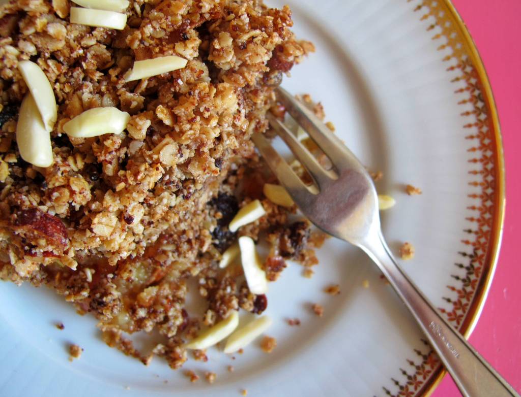 Kokosfett oder Ghee schmelzen, mit den anderen Zutaten vermischen und auf dem Boden einer feuerfesten Form festdrücken.
