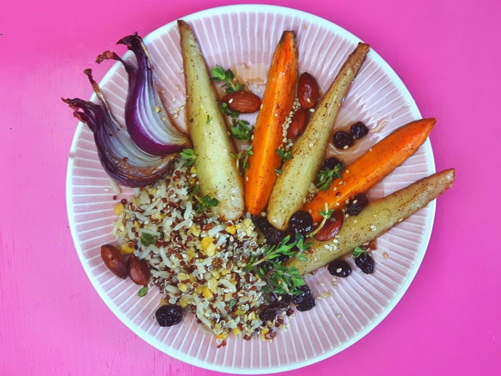 Zimmes eignet sich als erdendes Abendessen oder auch kalt als Snack zwischendurch. Das Gericht ist wunderbar schnell zubereitet und braucht ungefähr 30 Minuten im Ofen.